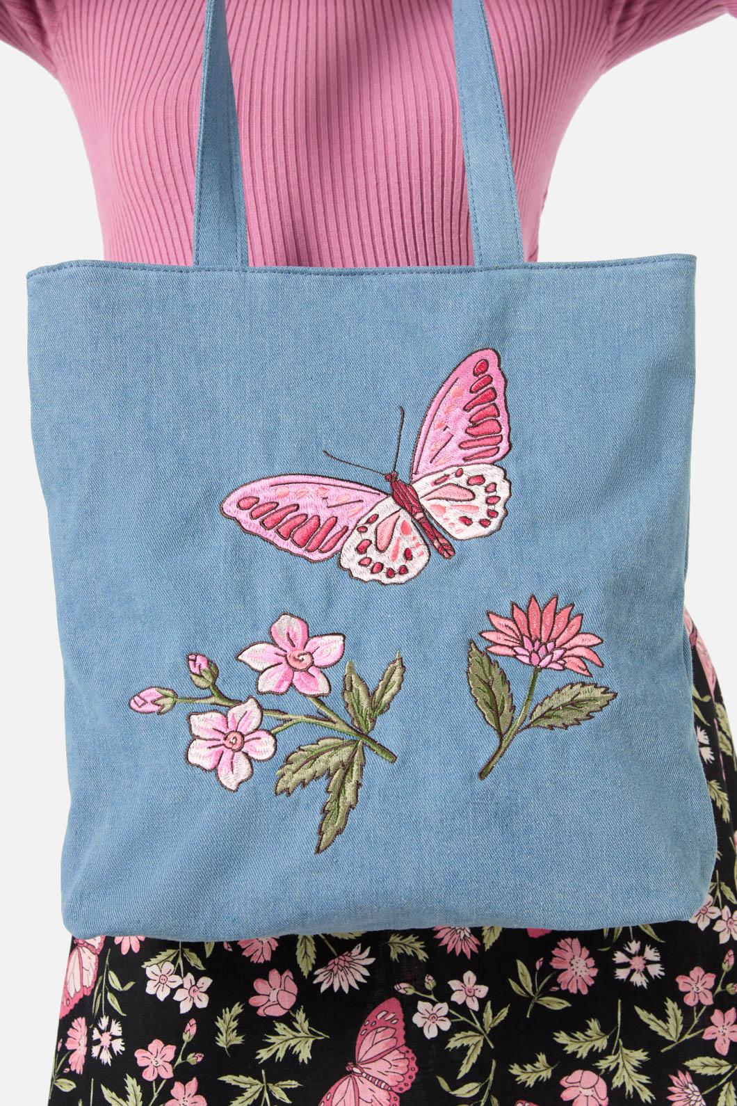 Bring a touch of playful charm to your everyday with the Embroidered Butterfly Denim Tote. Crafted from sturdy 100% cotton denim, this 35cm tote is embroidered with delicate pink and green florals intertwined with whimsical butterflies—adding a sweet, feminine flourish to any outfit.